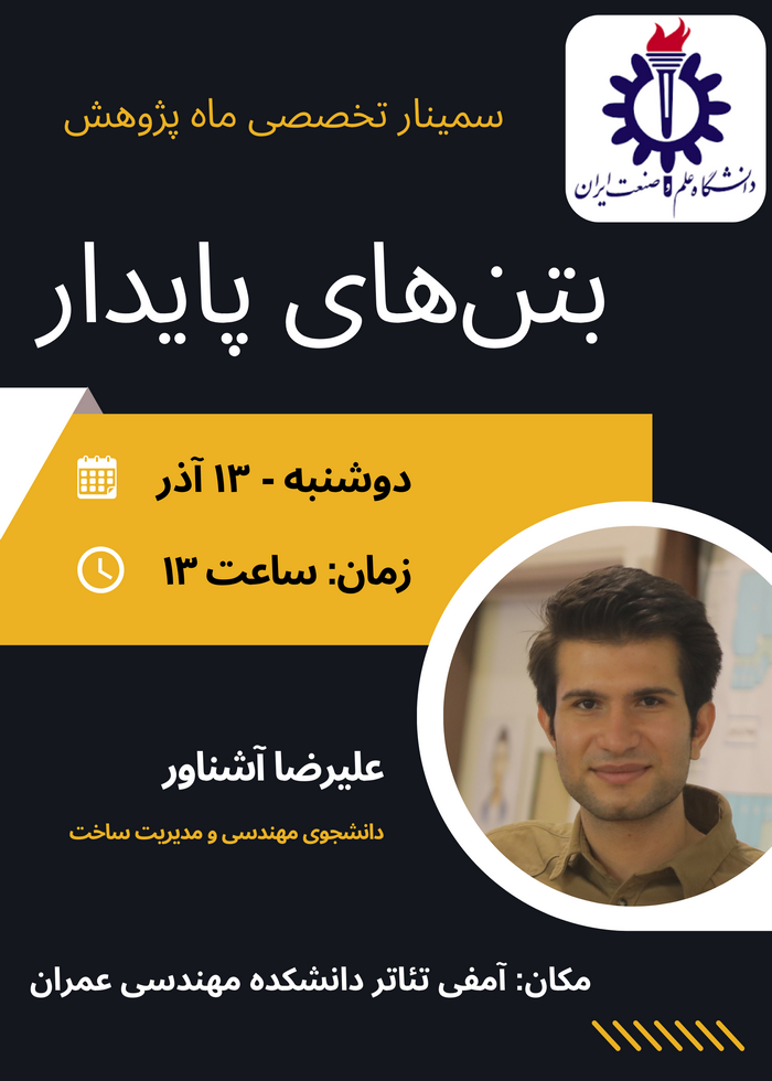 | دانشکده مهندسی عمران دانشگاه علم و صنعت ایران در نظر دارد سمینار تخصصی بتنهای پایدار توسط مهندس علیرضا آشناور، دانشجوی مهندسی و مدیریت ساخت برگزار نماید. این سمینار بهصورت حضوری در روز دوشنبه ۱۳ آذرماه ۱۴۰۲ ساعت ۱۳ در آمفیتئاتر ساختمان شماره ۲ دانشکده مهندسی عمران برگزار خواهد شد. از علاقهمندان جهت شرکت در این نشست دعوت بهعمل میآید. |